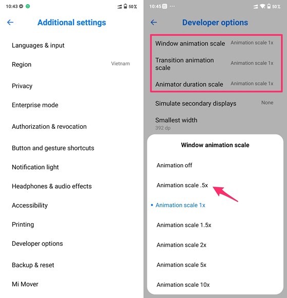 Mặc định, tốc độ hiển thị ảnh động sẽ là 1x, nếu muốn thay đổi, người dùng chỉ cần truy cập vào mục Developer options (tùy chọn nhà phát triển), tìm đến ba mục Windows animation scale (tỉ lệ hình động của cửa sổ), Transition animation scale (tỉ lệ hình động chuyển tiếp) và Animator duration scale (tỉ lệ thời lượng), sau đó điều chỉnh về mức .5x (nhanh), 2x, 5x, 10x (chậm) hoặc tắt hoàn toàn hiệu ứng (Animation off).