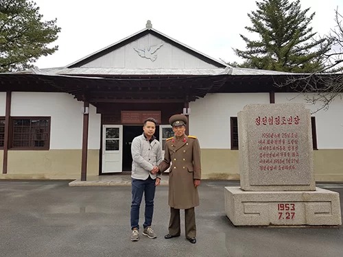 Anh Nguyễn Minh Vũ (trái), hướng dẫn viên của Vietravel, chụp ảnh lưu niệm tại khu phi quân sự DMZ, một trong những địa điểm được Triều Tiên cho phép du khách tham quan.