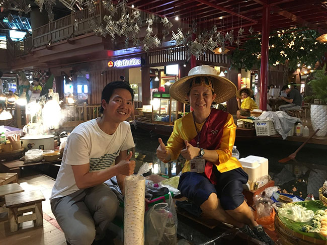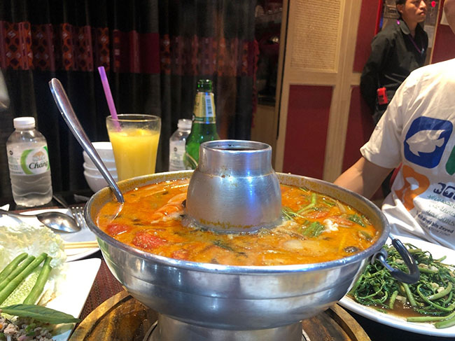 Nếu bạn thích lẩu Thái chua cay, thì hãy đến Bangkok mà ăn món Tôm Yam, rất là thú vị. Tôi thì thấy nó ngon là một chuyện, nhưng điểm thú vị với tôi là nó được nấu trên một cái nồi “thủng đít” để cho lửa xuyên qua. Lần đầu tiên tôi thấy một cái nồi như vậy!!