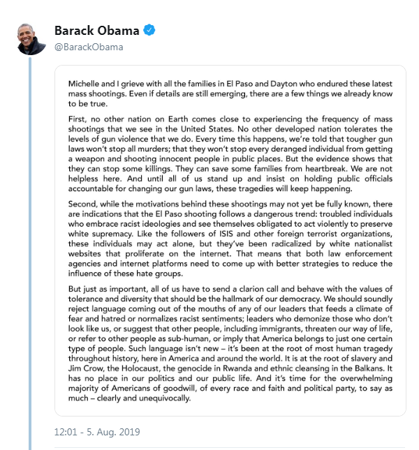 "Có những dấu hiệu cho thấy vụ xả súng ở El Paso theo một xu hướng nguy hiểm: Những cá nhân gặp rắc rối bám vào tư tưởng phân biệt chủng tộc và thấy mình có nghĩa vụ phải hành động bạo lực để bảo vệ quyền lực tối thượng của người da trắng", Obama phân tích.