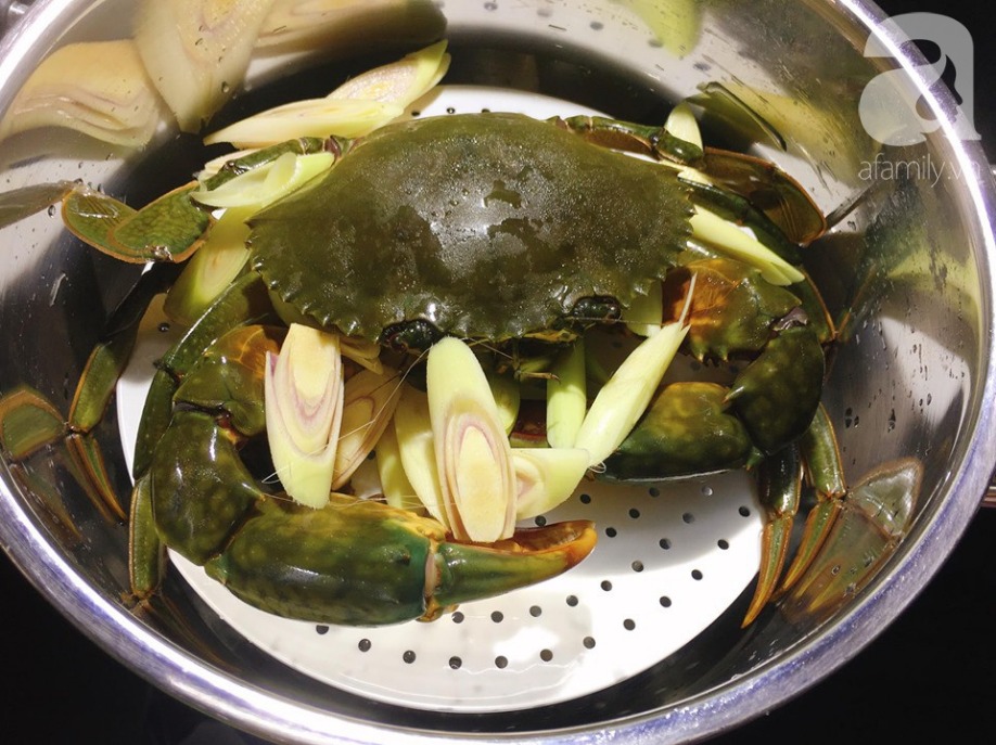 Dùng bàn chải đánh răng chà sạch từng kẽ chân, mai và bụng cua rồi rửa lại bằng nước sạch và cho vào nồi hấp. Cua rất nhanh chín nên chỉ cần cho 1 chén nước vào hấp để cua ngọt hơn, thêm 2 cây sả đập dập hoặc thái mỏng.
