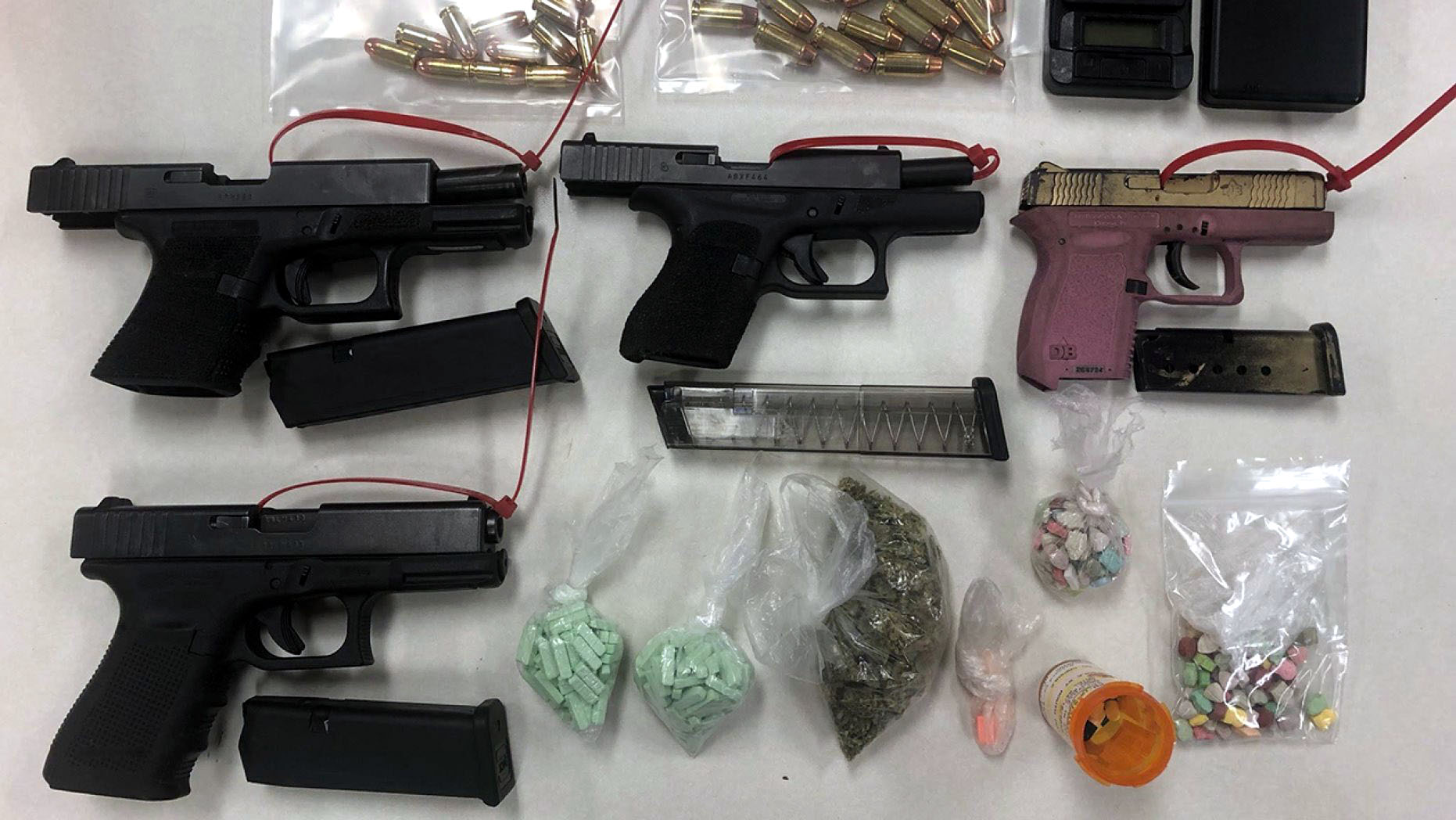 Bốn khẩu súng cùng với ma túy được tìm thấy trong nhà của hai nghi can hôm thứ Ba, 13 tháng 8, 2019. (Metro Nashville PD)