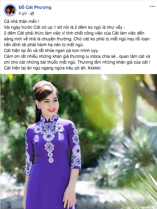 Đồng thời, nữ diễn viên cũng chia sẻ về tình trạng sức khỏe của mình. Cô cho biết bản thân đã ổn nhiều và khỏe trở lại. Cát Phượng tâm sự: “Cảm ơn rất nhiều những khán giả thương yêu chia sẻ, quan tâm tôi và chỉ cho tôi những bài thuốc mất ngủ. Thương lắm những khán giả của tôi. Tôi hiện tại ăn ngủ ngang ngữa trâu bò".
