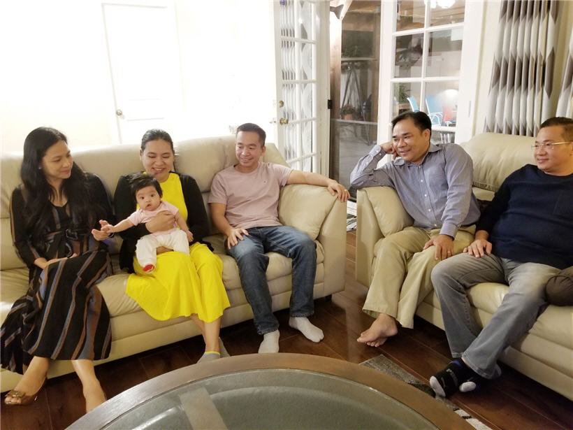 Bé Nguyễn Ngọc Hân trong vòng tay bố mẹ và sự vui mừng của vợ chồng anh Cường Lê (bìa phải và trái) và anh Thuần Ngô (thứ hai, phải). (Hình: Ngọc Lan/Người Việt)