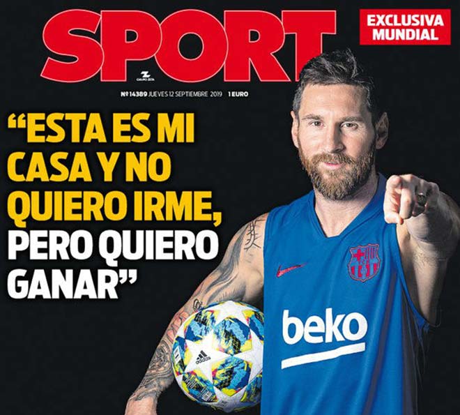 Messi trên bìa tờ Sport kèm câu nói: "Đây là nhà tôi, và tôi không muốn đi, nhưng tôi cũng muốn thắng"