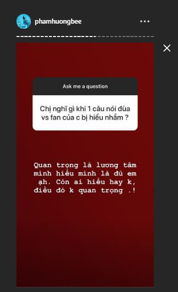 Ngày 17/9, nhận được câu hỏi: “Chị nghĩ gì khi một câu nói đùa với fan của chị bị hiểu nhầm?”, Phạm Hương thẳng thắn: “Quan trọng là lương tâm mình hiểu mình là đủ em ạ. Còn ai hiểu hay không, điều đó không quan trọng!”. Đây như một lời đáp trả của Phạm Hương dành cho những chỉ trích của cộng đồng mạng về thái độ của cô với fan hâm mộ.