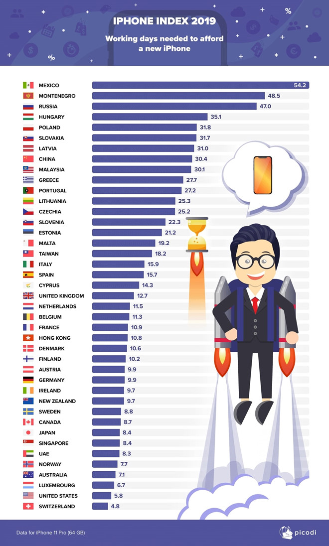 Picodi mới đây công bố iPhone Index 2019. Chỉ số cho biết người dân ở một số quốc gia cần làm việc bao nhiêu ngày để đủ tiền sở hữu chiếc iPhone 11 Pro phiên bản 64GB.