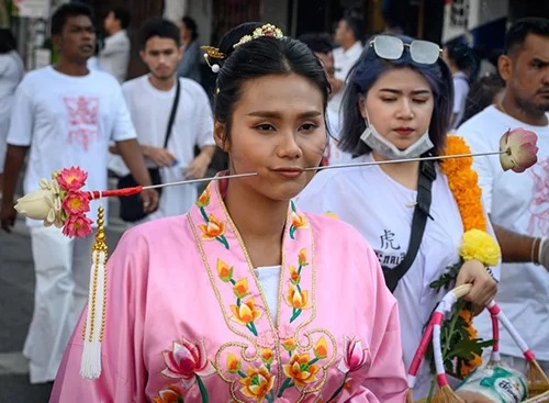Được tổ chức trên đảo Phuket, lễ hội ăn chay của Đạo giáo kéo dài 9 ngày diễn ra từ 28/9 đến 7/10. Ngày 3/10, những tín đồ xuống đường diễu hành với vô số vật dụng sắc nhọn đâm xuyên qua má hoặc thực hiện những màn hành xác đau đớn, khiến du khách khiếp sợ.