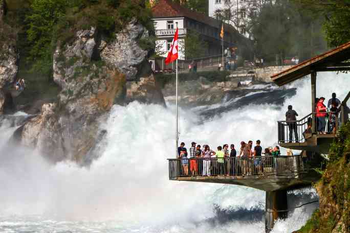 Nằm ở Schaffhausen, Rhine là thác nước lớn nhất châu Âu. Nước sông quanh năm dâng đầy có lúc chảy mạnh ào ạt vào vách núi, song cũng có lúc chảy êm ả, hiền hòa như mặt nước hồ. Thác nước hùng vĩ với dòng chảy ào ạt đổ xuống thung lũng hẹp, bọt nước bắn tung tóe tạo nên khung cảnh hùng vĩ.