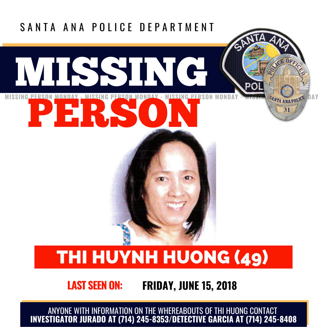 Cảnh sát tìm bà Huỳnh Thị Hương. Sở Cảnh Sát Santa Ana vào hôm thứ Hai vừa qua đã đưa ra một thông báo nhờ dân chúng trợ giúp tìm một người mà cảnh sát nói là mất tích trong hơn một năm.