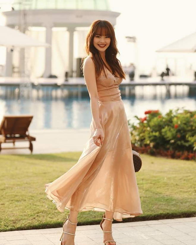 Minh Hằng chọn diện mẫu váy màu nude trang nhã, kết hợp cùng đó là đôi giày cao gót quai ngang và túi cầm tay sang trọng. Chỉ cần trang điểm nhẹ nhàng và để tóc buông xõa là cô đã có diện mạo tươi tắn hết sức.