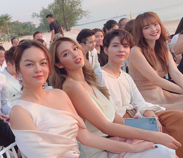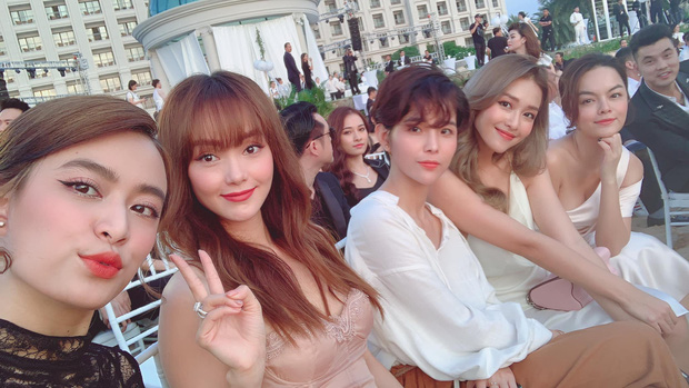 Trước khi hôn lễ chính thức được diễn ra trên bãi biển Phú Quốc, dàn khách mời "khủng" có mặt từ rất sớm, tranh thủ chụp ảnh selfie. Phạm Quỳnh Anh, Hoàng Thùy Linh, Minh Hằng, Vũ Cát Tường, Khả Ngân, Sara Lưu là những người đẹp ngồi sát gần nhau. Họ cùng nhau chụp chung vài tấm hình làm kỷ niệm.
