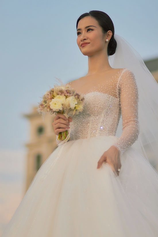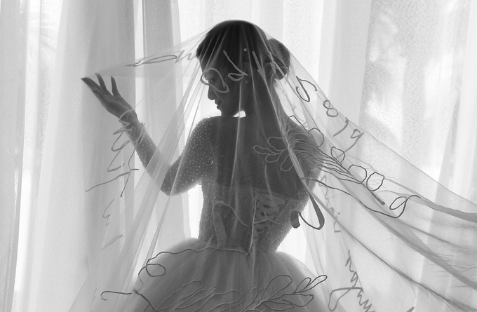 Khăn voan mỏng dài 5 m được Đông Nhi kết hợp với đầm. Ảnh: Kim Bánh Trôi Nước.