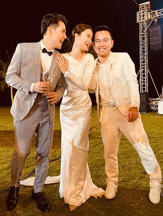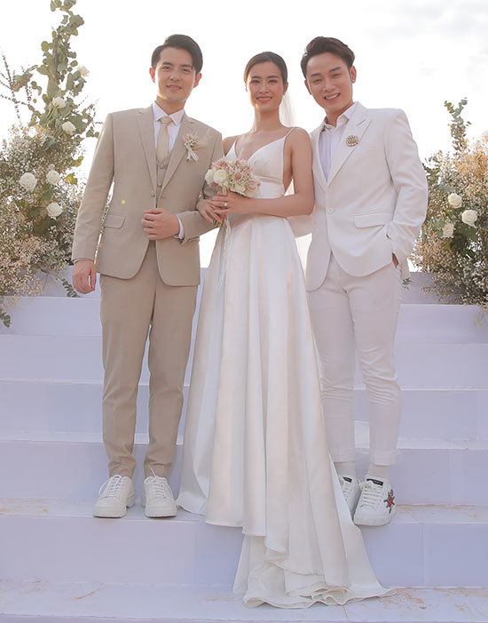 Bộ suit của Ông Cao Thắng được cắt may bằng vải nhập từ Italy. Chú rể diện thiết kế màu xám, kem và trắng cho tiệc cưới.