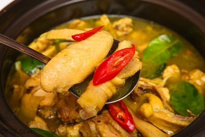 Bạn hãy chờ cho tới khi nước đã sôi bạn nêm nếm lại gia vị cho vừa miệng, rồi đun sôi nồi gà với ngọn lửa nhỏ để gà được chín mềm. Khi gà đã mềm vừa ăn thì cho phần lá chanh thái lát vào, đảo đều tay cho tới khi món ăn chín mềm là được