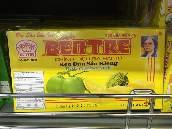 Sản phẩm kẹo dừa bến tre loại sầu riêng của bà Phạm Thị Tỏ hay còn gọi là Bà Hai Tỏ