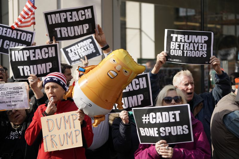 Anti-Trump protestors chant while President Donald Trump speaks at the 100th New York City Veterans Day Parade on Monday. (Barry Williams for New York Dail/for New York Daily News)