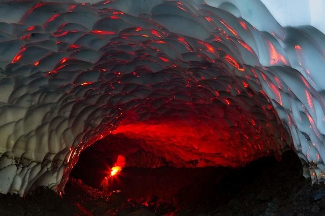Các nhà khoa học phát hiện ra một hang đá, nằm trên bán đảo Kamchatka, Nga. Nơi này có núi lửa và hang băng hình thành bên cạnh nhau. Tuy nhiên, hiện nay sông băng đã tan chảy rất nhiều và lớp trên của hang động trở nên rất mỏng, nhưng điều này tạo nên một khung cảnh đầy màu sắc hiếm có.
