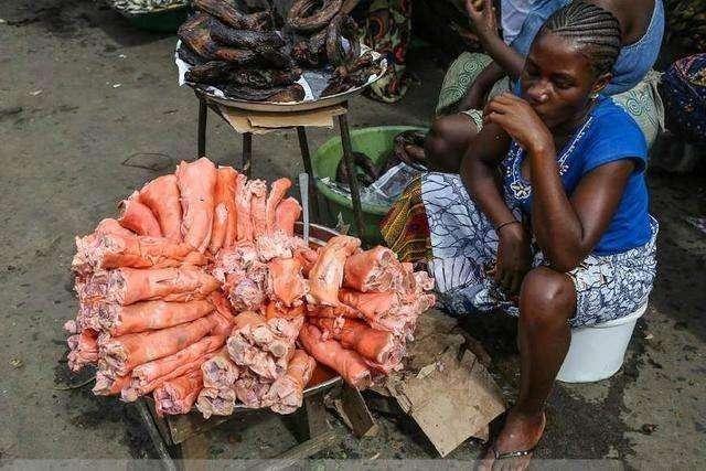 Ghé ngang qua một khu chợ địa phương ở châu Phi, du khách có thể thấy rất nhiều quầy hàng lụp xụp, hay người dân bày biện bán ngay ngoài đường, chẳng hạn như là móng giò lợn chẳng hạn.