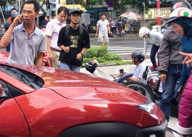 Sau khi tông trúng ba xe máy, ô tô lao đến đụng trúng các phương tiện khác đang chờ phía trước. Có khoảng sáu xe máy ngã nhào.