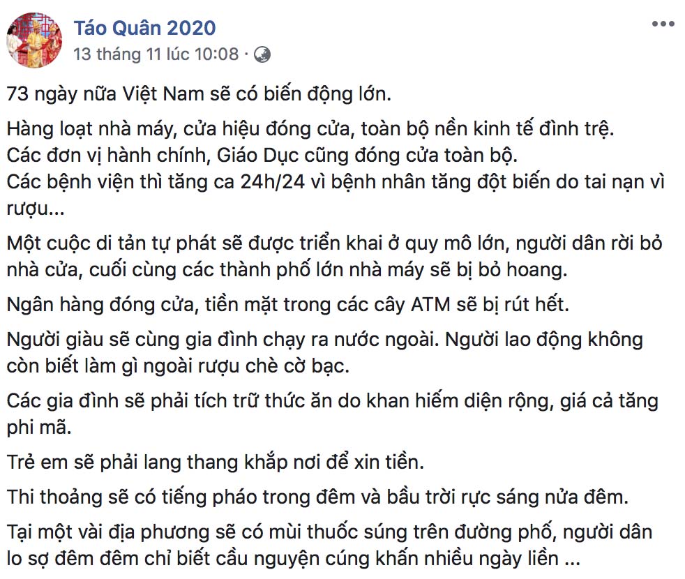 Cụ thể, trang fanpage được cho là Táo quân 2020 chia sẻ: "73 ngày nữa Việt Nam sẽ có biến động lớn. Hàng loạt nhà máy, cửa hiệu đóng cửa, toàn bộ nền kinh tế đình trệ. Các đơn vị hành chính, giáo dục cũng đóng cửa toàn bộ.Các bệnh viện thì tăng ca 24h/24 vì bệnh nhân tăng đột biến do tai nạn vì rượu...