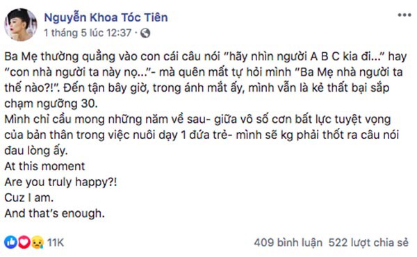 Trên trang cá nhân, ca sĩ Tóc Tiên vừa đăng dòng trạng thái có nội dung: "Ba mẹ thường quẳng vào con cái câu nói "hãy nhìn người ABC kia đi" mà quên mất tự hỏi mình "Ba mẹ nhà người ta thế nào?".