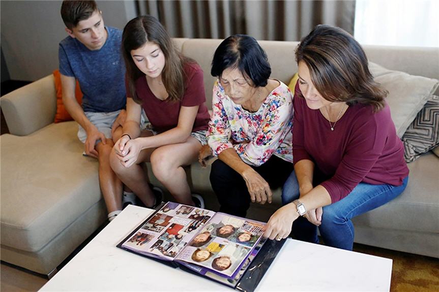 Bà Small cùng hai con và bà Đẹp xem cuốn album hình thời thơ ấu bà Small mang từ Mỹ về tặng mẹ. (Hình: Reuters)