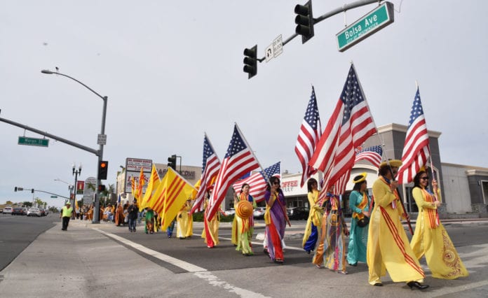 Đoàn biểu tình với một rừng cờ Hoa Kỳ và cờ Việt Nam Cộng Hòa, cùng biểu ngữ chống Cộng Sản Việt Nam và chống Việt Gian tại Little Saigon, xuất phát từ trường Carrilo Elementary, đi dọc theo đường Bushard, hướng về đại lộ Bolsa, đi ngang qua tượng Đức Thánh Trần đến đường Magnolia, quẹo ngược trở về Bolsa, theo lộ trình cũ trở về trường nơi xuất phát, sau đó về trường Warner Middle School trên đường Newland.