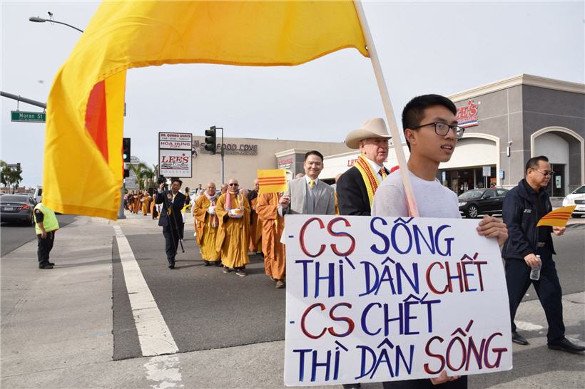 Hàng trăm tăng ni và Phật tử hệ thống chùa Tầm Nguyên, Bắc California, kết hợp cùng Phật tử từ khắp các tiểu bang Hoa Kỳ và tại Little Saigon, xuống đường biểu tình tuần hành chống Cộng Sản Việt Nam và chống Việt gian tại Little Saigon, thành phố Westminster.