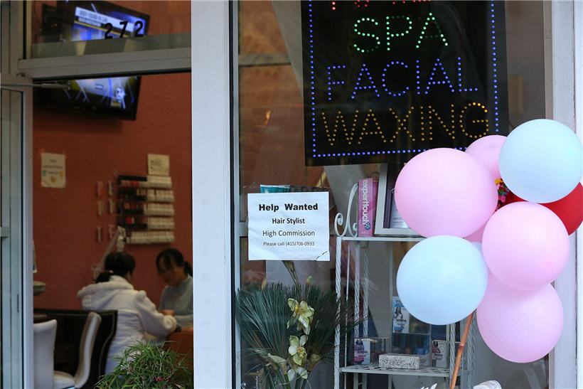 Một tiệm nail ở San Francisco, California thông báo tuyển thợ. (Hình: Justin Sullivan/Getty Images)