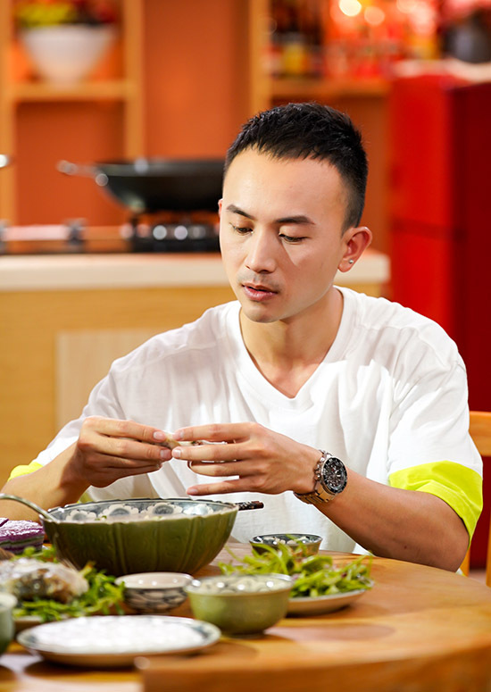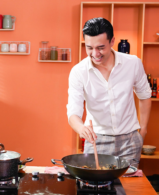 'Chàng Vũ' vui vẻ xắn tay áo vào bếp, trổ tài nấu nướng. Anh chia sẻ: 'Tôi thích tự tay làm các món ăn yêu thích, đậm hương vị quê hương. Khi có thời gian rảnh tôi hay rủ bạn bè về nhà thưởng thức ẩm thực miền Tây Nam Bộ do chính mình nấu'.
