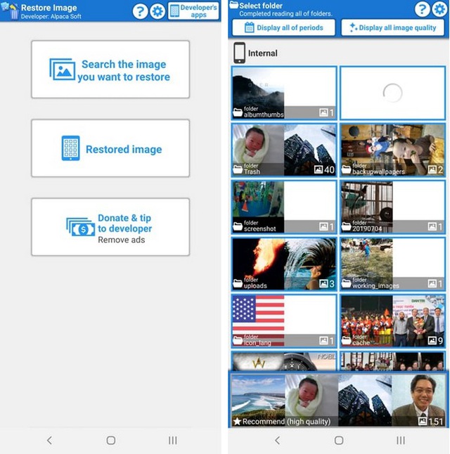 Để bắt đầu quá trình tìm kiếm và khôi phục các hình ảnh đã bị xóa trên smartphone, từ giao diện chính của ứng dụng, bạn nhấn nút “Search the image you want to restore”. Lập tức danh sách những hình ảnh đã bị xóa mà ứng dụng có thể khôi phục sẽ được liệt kê và được phân chia theo từng thư mục riêng biệt, là những thư mục mà các hình ảnh đã được lưu trên smartphone trước khi bị xóa, điều này giúp người dùng có thể tìm được những hình ảnh mà mình đã vô tình xóa trước đây một cách dễ dàng hơn.