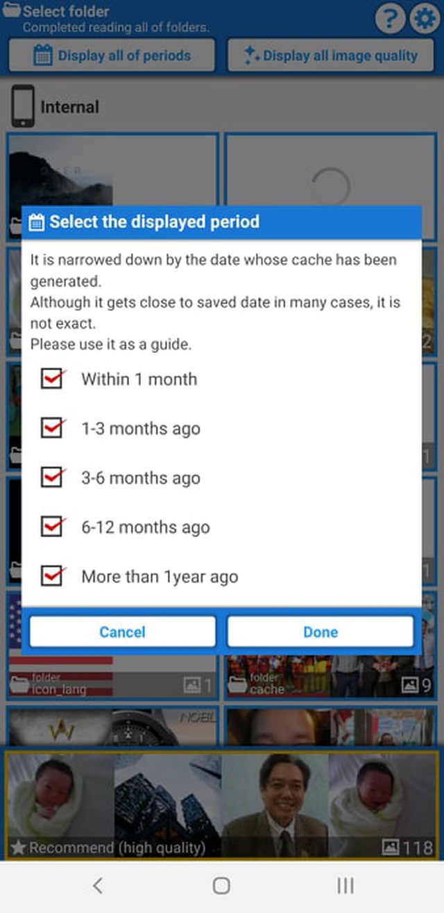 Để tìm kiếm những hình ảnh đã bị xóa và cần khôi phục một cách dễ dàng hơn, bạn có thể nhấn vào nút “Display all of periods” ở bên trên, sau đó đánh dấu vào tùy chọn “within 1 month” để ứng dụng chỉ hiển thị những hình ảnh đã bị xóa trong vòng cách đây một tháng, tương tự bạn có thể đánh dấu để chọn hiển thị các hình ảnh đã bị xóa trong phạm vi từ 3 tháng đến hơn một năm.