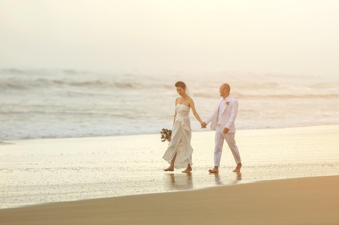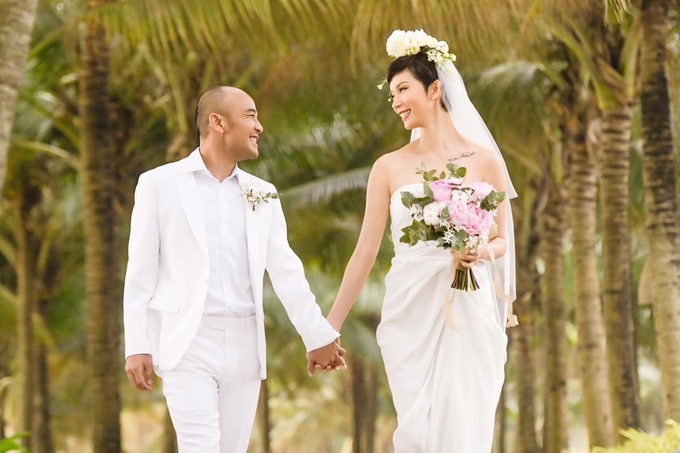 Xuân Lan trong bộ váy cưới do Đỗ Mạnh Cường thiết kế. Anh cũng đưa các con ra Đà Nẵng ăn cưới bạn thân.