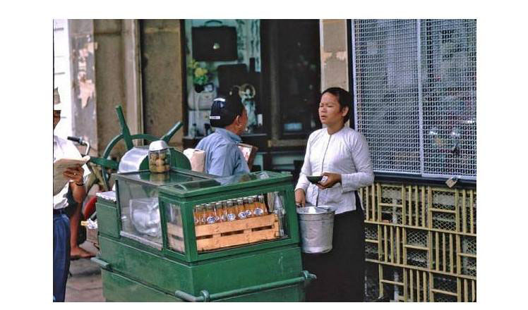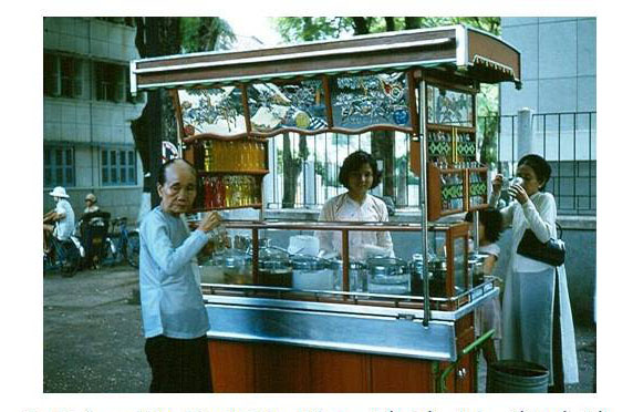 Xe đẩy bán rau má, nước ngọt. Có thể thấy người bán đang chặt đá, kế bên là thanh gỗ để làm đá bào (dành cho món xi rô đá bào mà học sinh rất yêu thích.