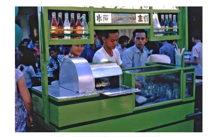 Xem hình ảnh uống nước giải khát ở Sài Gòn 50 năm trước. Những chiếc xe đẩy bên đường phố, coca cola, và những bịch nước ngọt. Nước mía ép bằng tay truyền thống......
