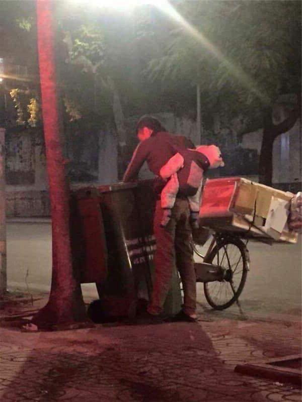 Sao mà không chua xót cay đắng cho được. Hình ảnh người Cha đang bới thùng rác, trên lưng địu đứa con thơ để mong kiếm gì đó thừa để mang về dùng, có thể thức ăn hay đồ gì đó bỏ đi của người khác, nếu còn dùng được thì Anh sẽ đem về dùng, nó không phải là riêng anh ta.