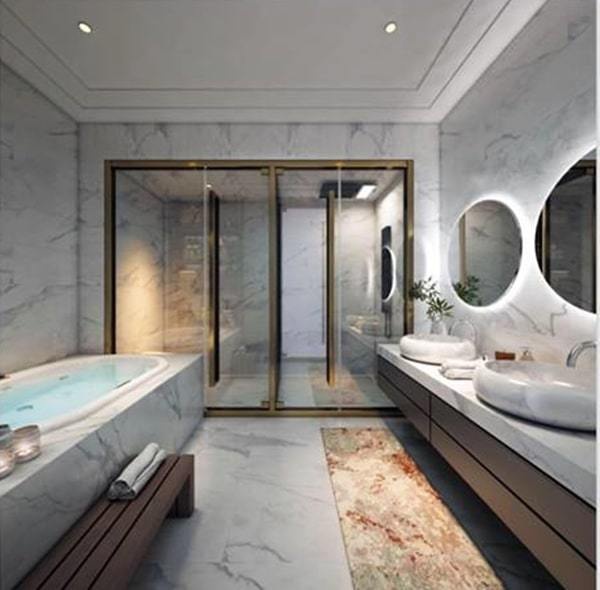 Phòng tắm có diện tích rộng với những tiện nghi cao cấp, hiện đại. Theo tìm hiểu, tổ ấm mới của giọng ca Nắm lấy tay anh nằm trong khu dân cư cao cấp ở Hà Nội. Hai vợ chồng anh mua nhà từ giữa năm 2019 nhưng đến đầu năm 2020, sân vườn mới hoàn thành. Đây là biệt thự đầu tiên của cả hai sau khi đã sở hữu 3 căn hộ cao cấp.