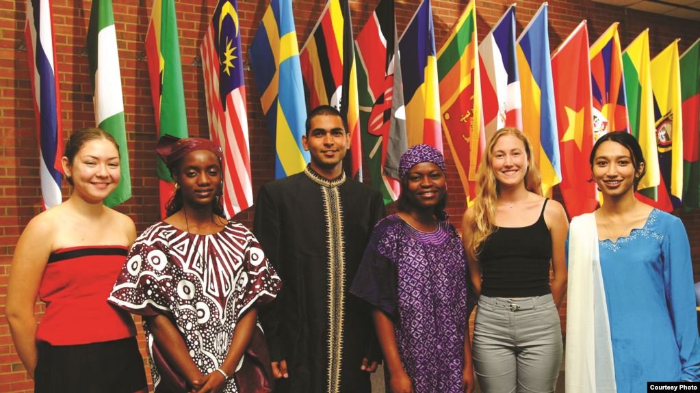 Sinh viên quốc tế Trường đại học Berea ở tieu bang Kentucky đứng trước cờ của 70 nước có sinh viên theo học (Ảnh của trường Berea)
