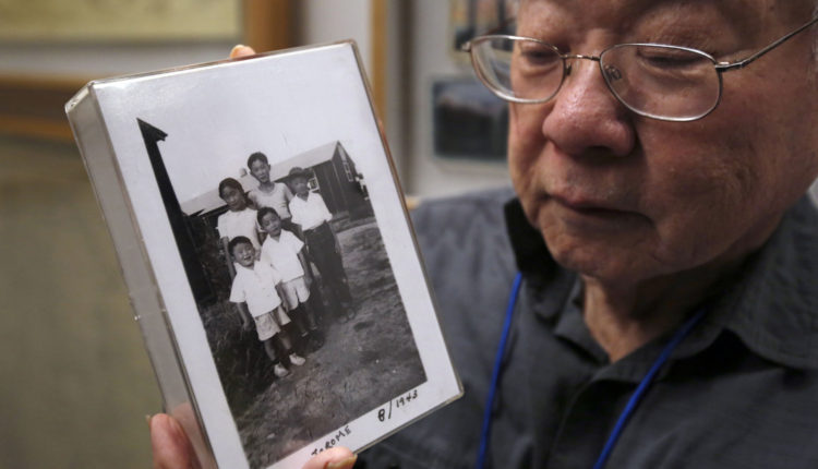 Ông Les Ouchida cầm tấm hình chụp gia đình trong trại tập trung giam giữ năm 1943.(Hình: AP Photo/Rich Pedroncelli)