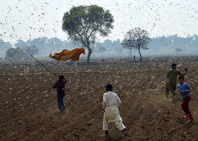 Những đứa trẻ cố gắng xua đuổi đàn châu chấu sa mạc dày đặc ở huyện Okara, tỉnh Punjab, miền Đông Pakistan hôm 15/2. Một số quốc gia ở Đông Phi, Tây Á và Nam Á đang trong tình trạng bị châu chấu sa mạc tấn công. Ảnh: Tân Hoa Xã.