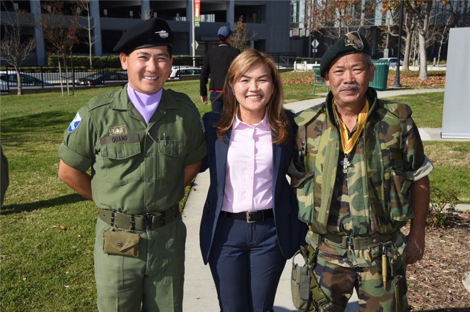 Nghị Viên Diedre Thu Hà Nguyễn (giữa) và hai cựu quân nhân QLVNCH. (Hình: diedrenguyen.com)