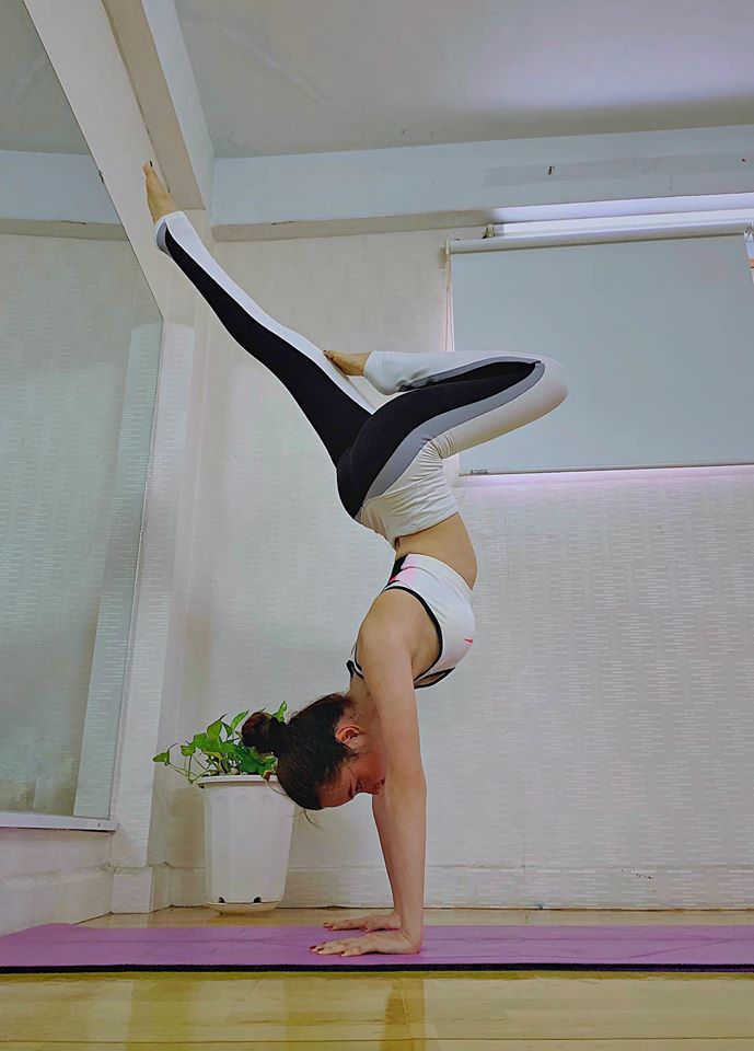 Ngoài gym, người đẹp còn tập thêm yoga.