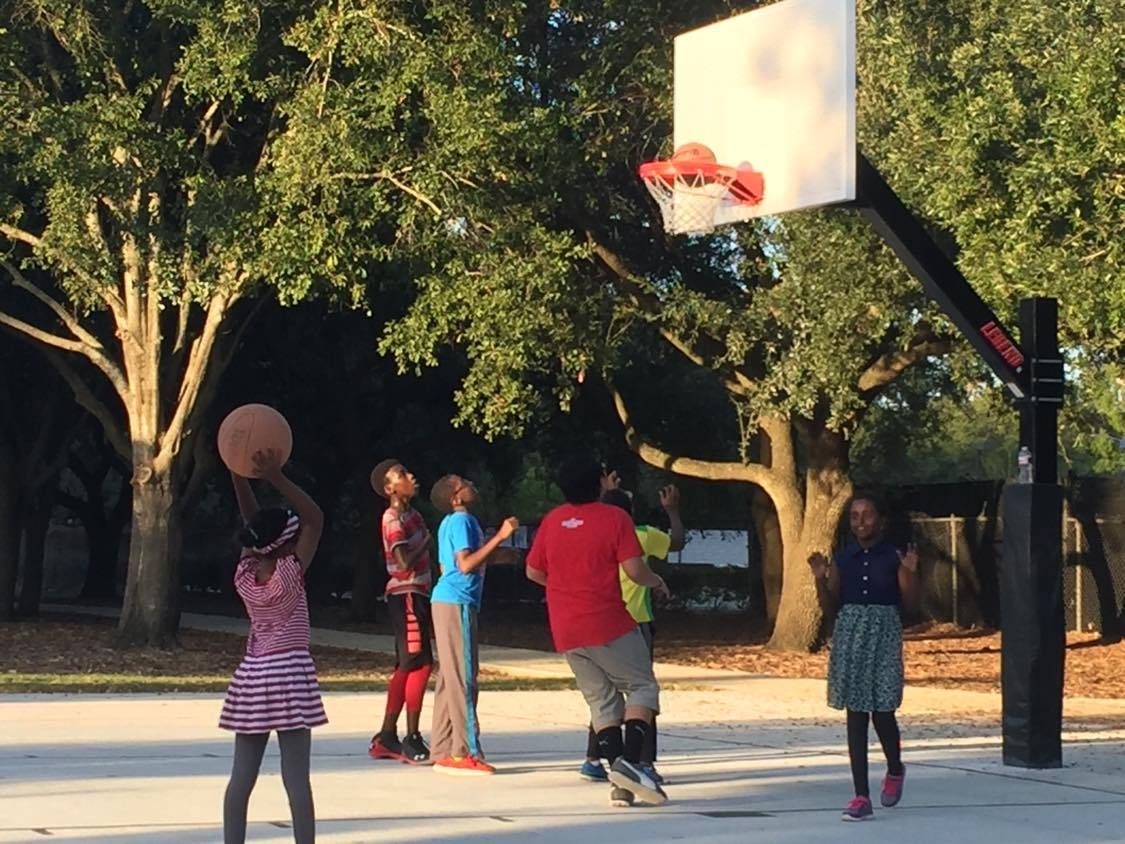 Học sinh Việt Nam cùng học sinh Mỹ chơi bóng rổ.