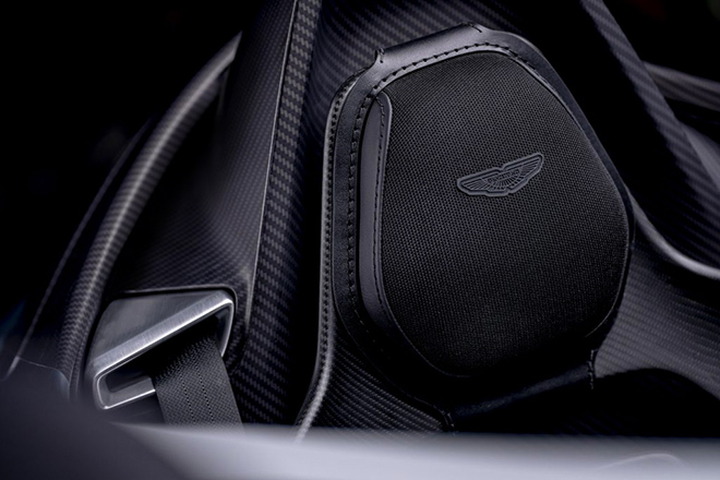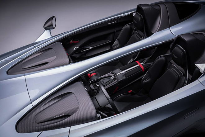 Bên trong khoang nội thất của chiếc V12 Speedster đầy hấp dẫn này là sự kết hợp giữa các chất liệu cao cấp như sợi carbon và da thủ công, chrome, nhôm và cao su in 3D và đặc biệt, thay cho hộc để đồ truyền thống ở khu vực ghế hành khách, Aston Martin sử dụng túi da có thể tháo rời.