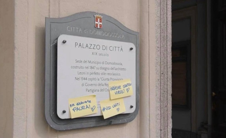 Những thông điệp kêu gọi đoàn kết và động viên người dân được dán ở bảng hiệu của tòa thị chính thành phố Domodossola hôm 10/3. Ảnh: Stella Vũ