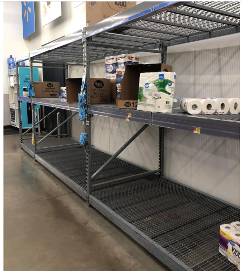 Kệ giấy vệ sinh trong siêu thị Walmart ( là chuỗi siêu thị lớn nhất nước Mỹ) trống trơn sau khi Trump công bố tình trạng khẩn cấp.