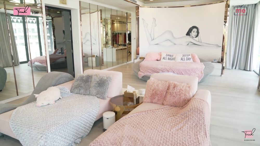 Đặc biệt nhất, có lẽ là căn phòng trong mơ của Ngọc Trinh. Căn phòng được thiết kế gồm rất nhiều gương và liền mạch, không có nhiều vách ngăn, phù hợp với tính cách phóng khoáng của cô.