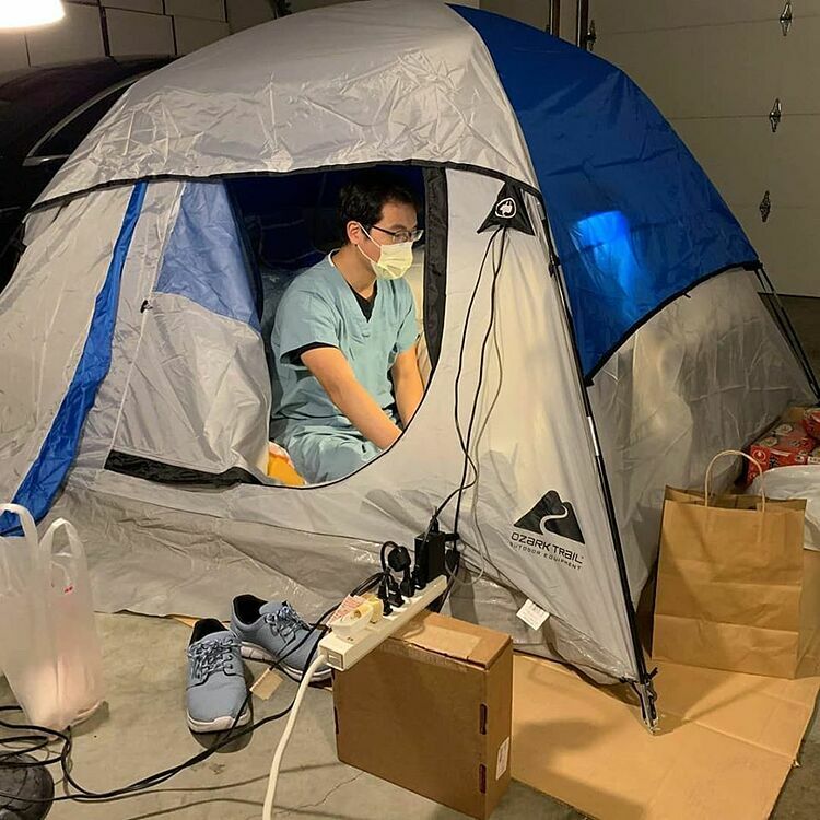 Một bác sĩ chuyên khoa phổi ở Mỹ đang tham gia tuyến đầu chống Covid-19, Timmy Cheng lo mình sẽ lây bệnh cho vợ con nên ngủ ngoài gara, từ ngày 14/3.