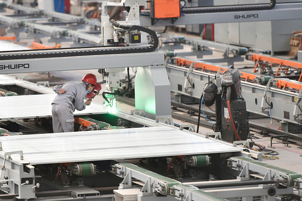 Một công nhân đang quan sát một chiếc máy hàn nhôm tại một nhà máy ở Zouping, tỉnh Sơn Đông, Trung Quốc vào ngày 14/3/2020. (STR / AFP / Getty Images)